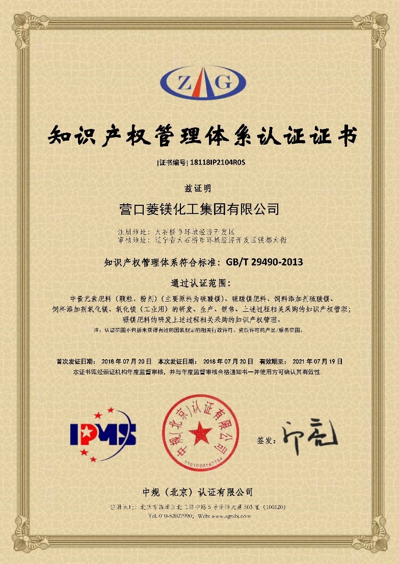集团公司是国家高新技术企业,在致力于镁肥料、镁饲料添加剂及含镁功能性材料产品创新研发的同时,高度重视知识产权工作,目前已申请专利21项,获得授权专利9项,其中发明专利2项,实用新型专利7项;拥有注册商标2项;主持起草完成国家标准2项。